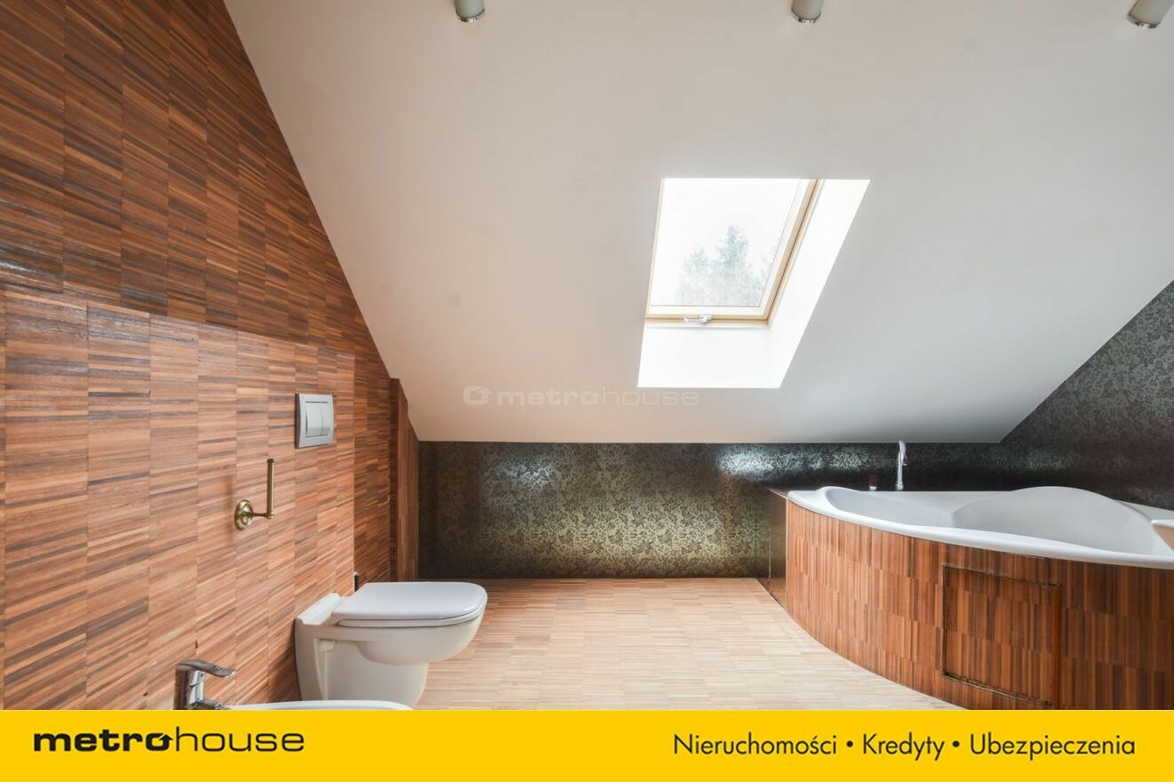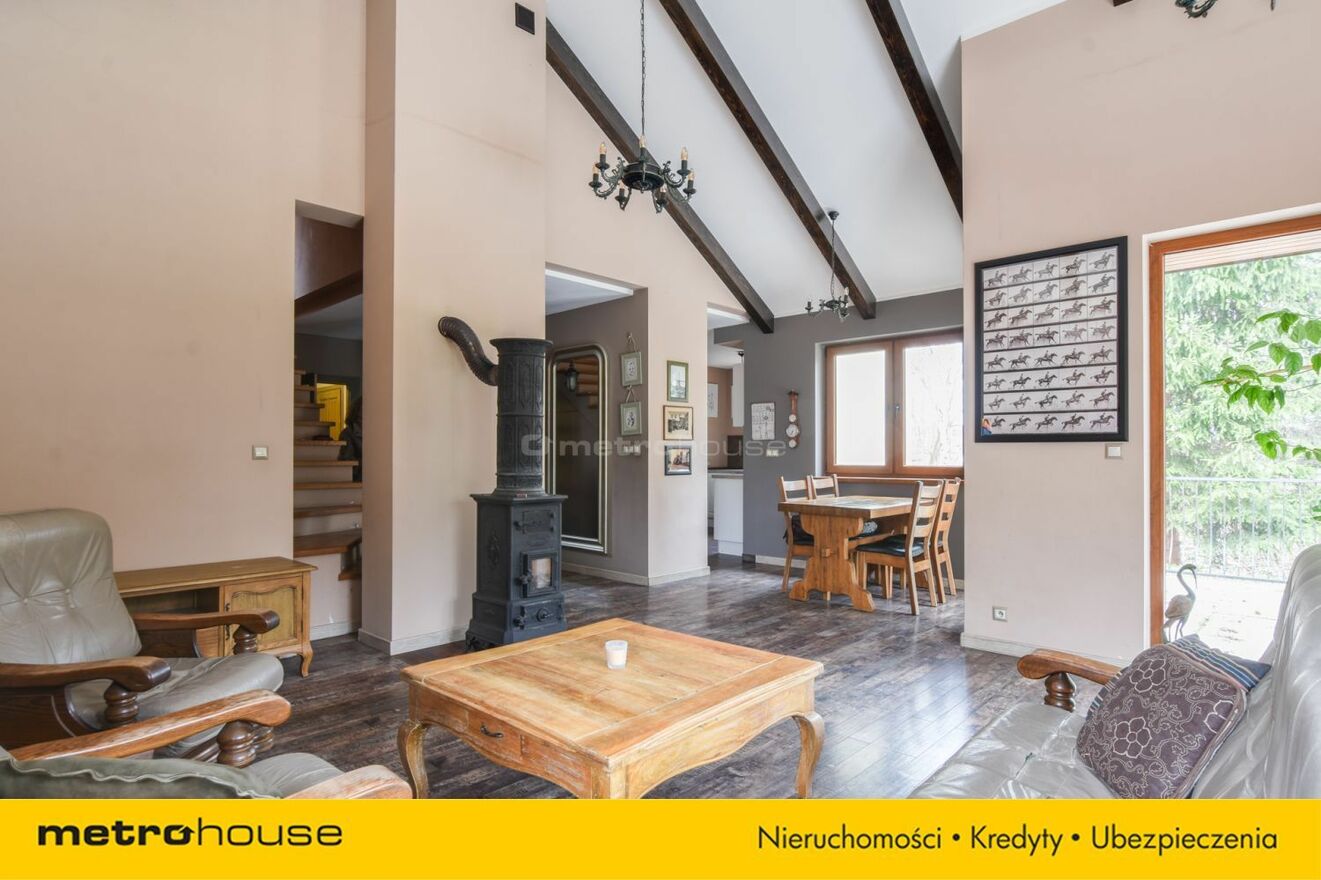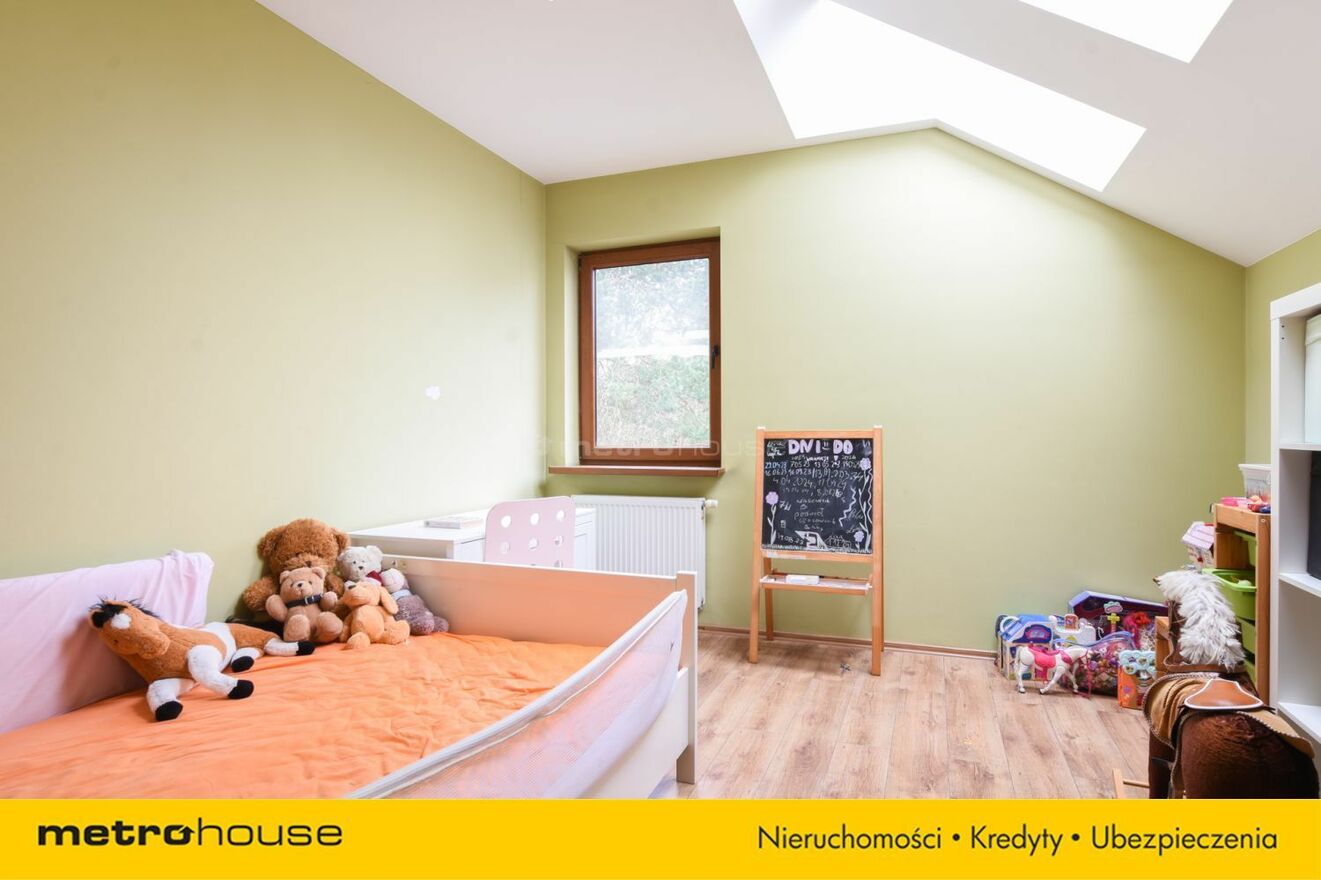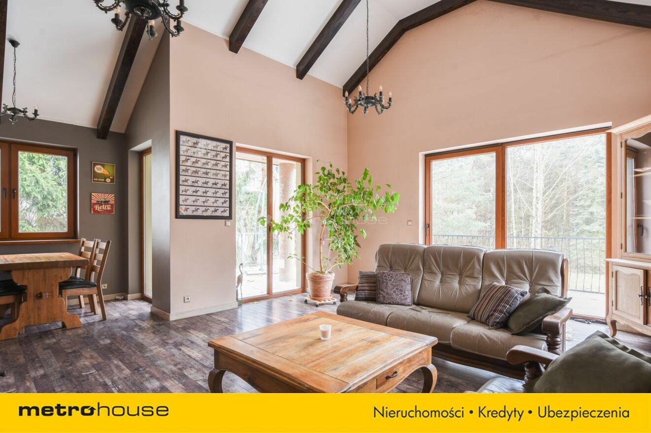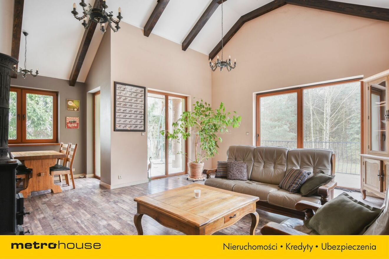 Część dzienna obejmuje przestronny salon z jadalnią i kominkiem, z którego roztacza się widok na malowniczą, zalesioną działkę. Dodatkowo znajduje się tu gabinet, który doskonale sprawdzi się jako miejsce do pracy lub biblioteka. Do dyspozycji jest również garaż, zapewniający wygodę i bezpieczeństwo dla samochodu.
