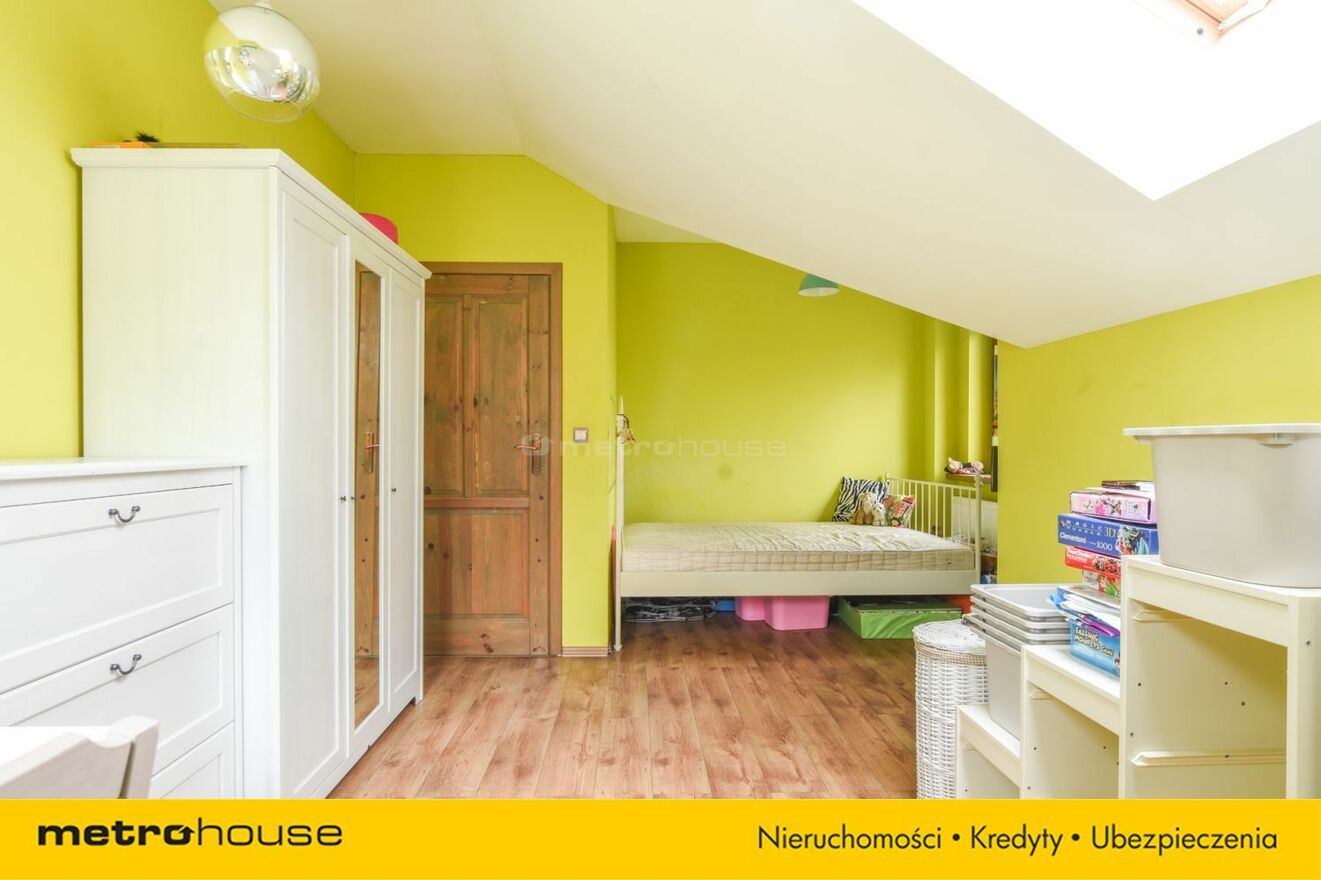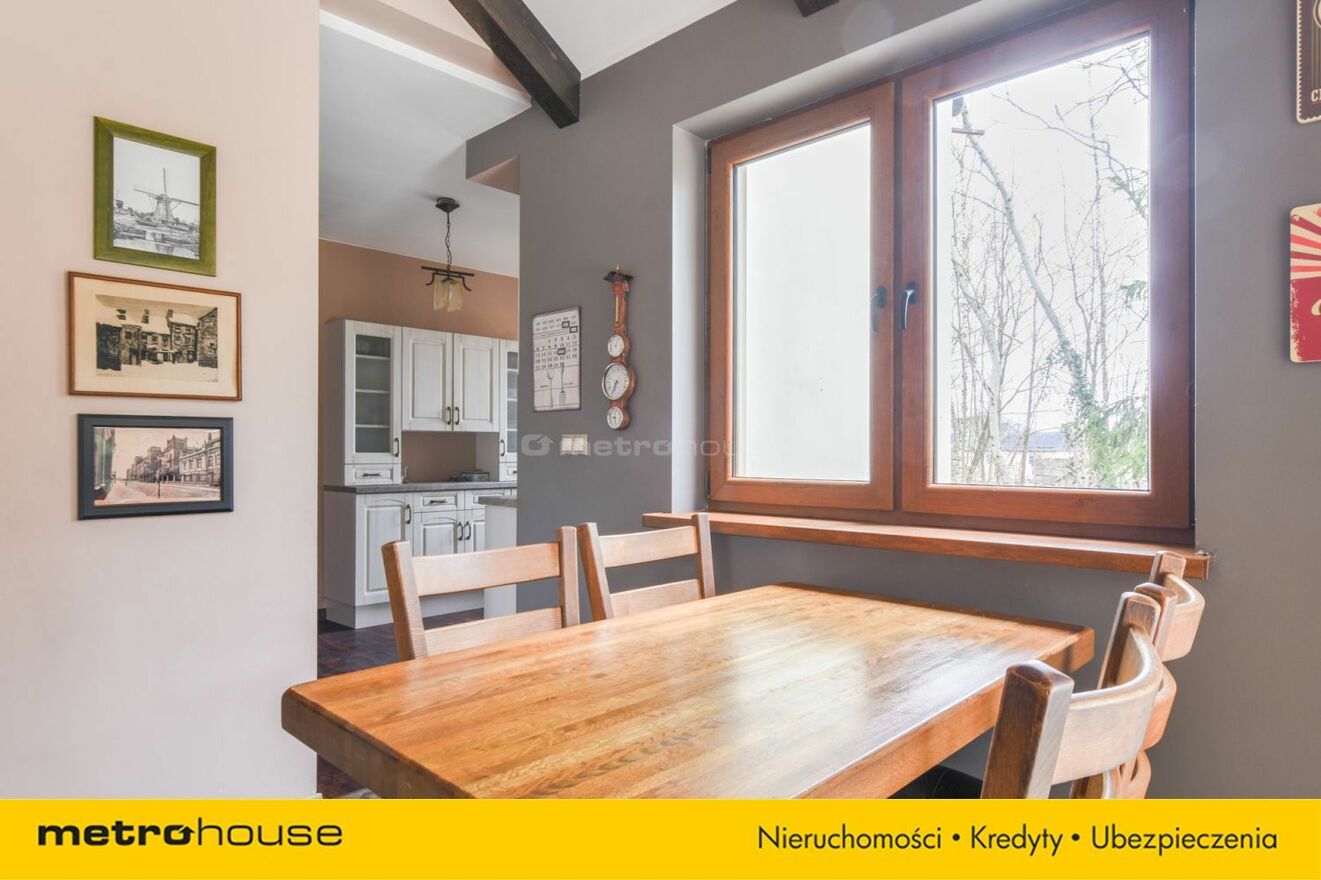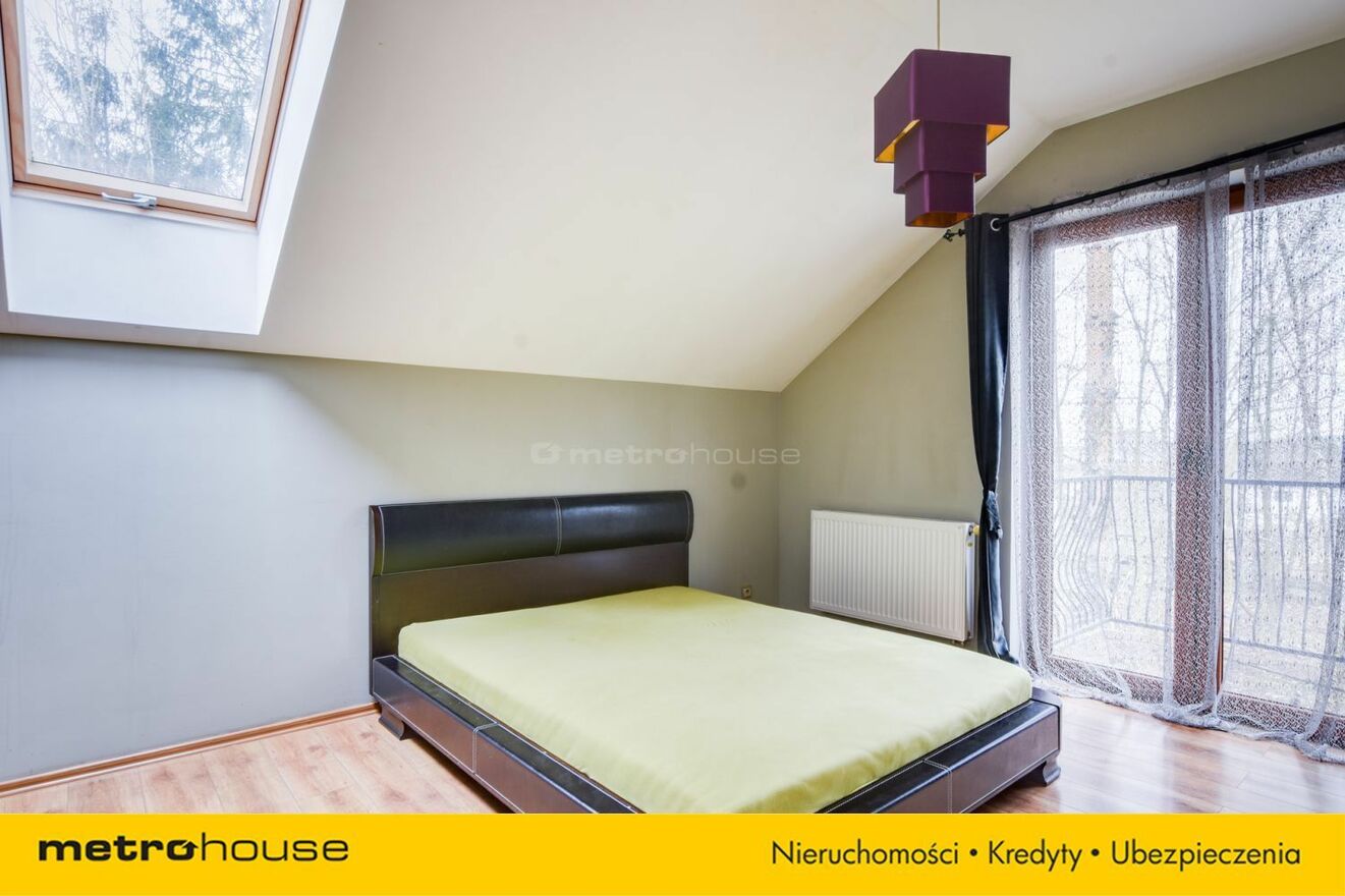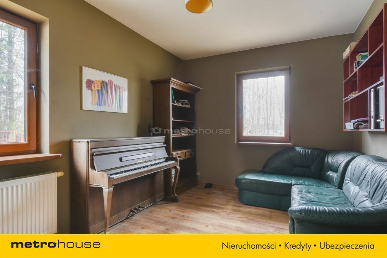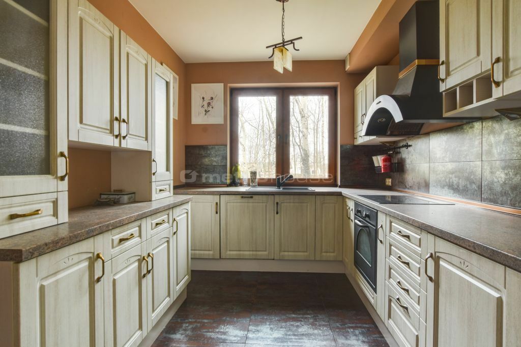 Część dzienna obejmuje przestronny salon z jadalnią i kominkiem, z którego roztacza się widok na malowniczą, zalesioną działkę. Dodatkowo znajduje się tu gabinet, który doskonale sprawdzi się jako miejsce do pracy lub biblioteka. Do dyspozycji jest również garaż, zapewniający wygodę i bezpieczeństwo dla samochodu.